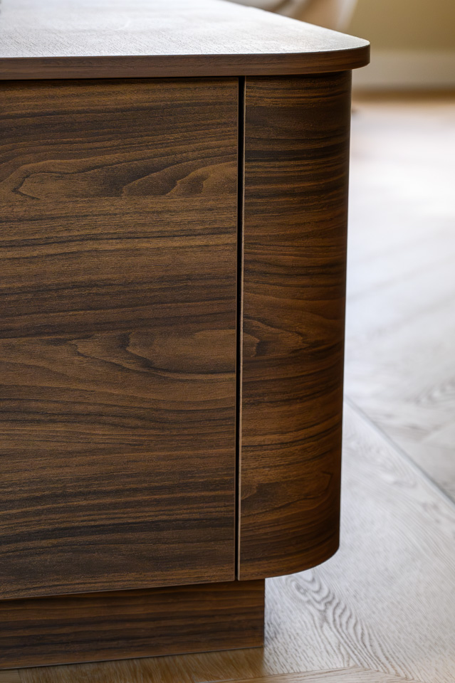 Een erker bank, TV-meubel en dressoir in 1 meubel op maat. In het meubel zitten 6 stopcontacten verwerkt en alle binnen en buitenhoeken hebben wij in een ronde vorm gemaakt.