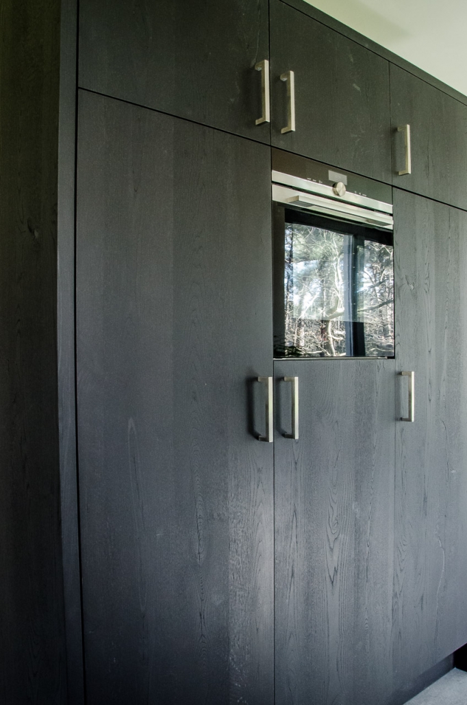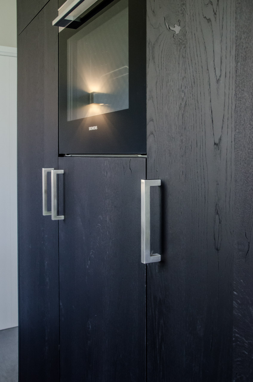 Bij deze keuken hebben wij een losse hoge zwarte kast van eiken balk fineer gemaakt.