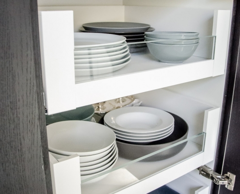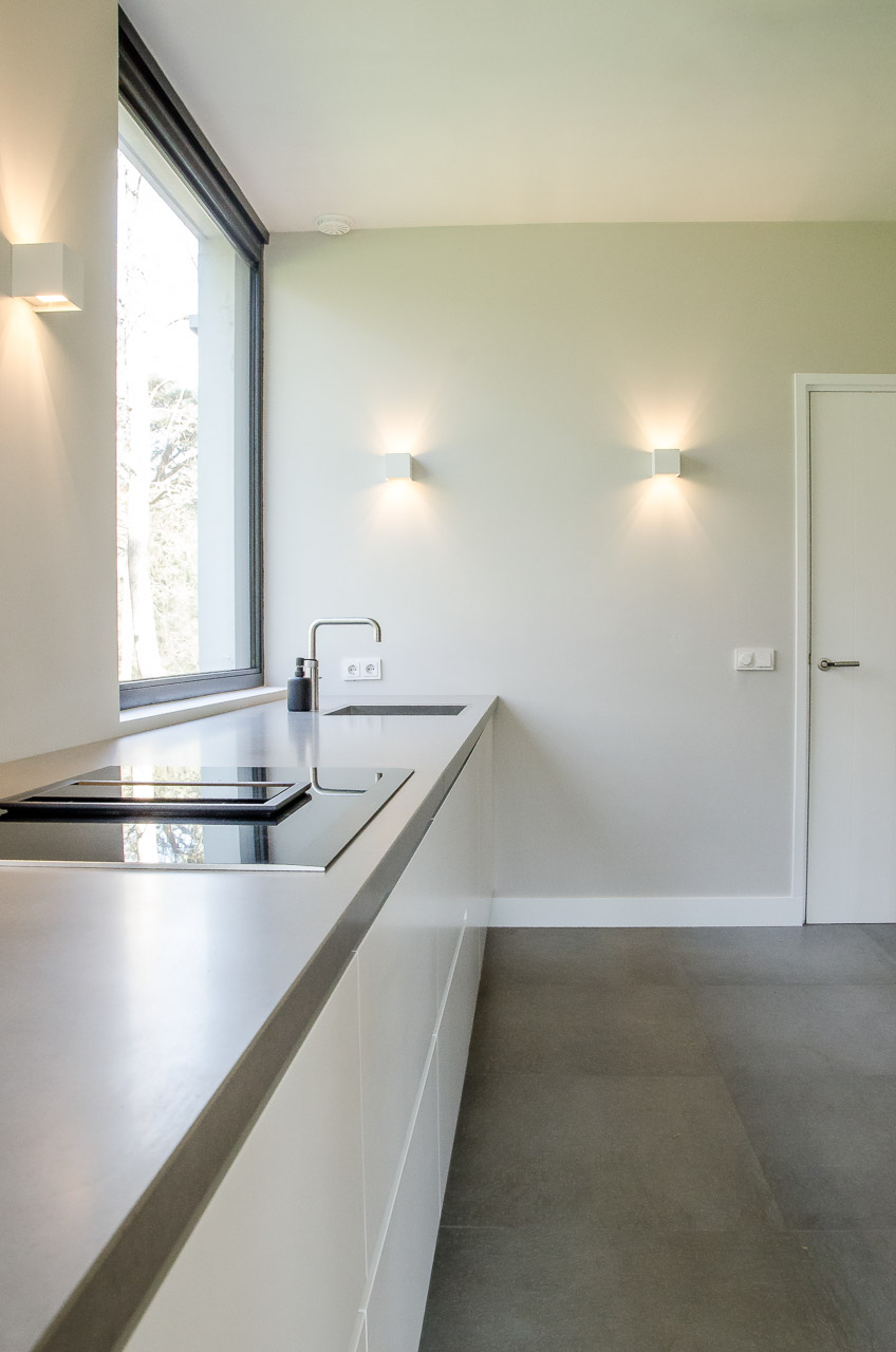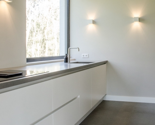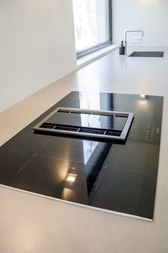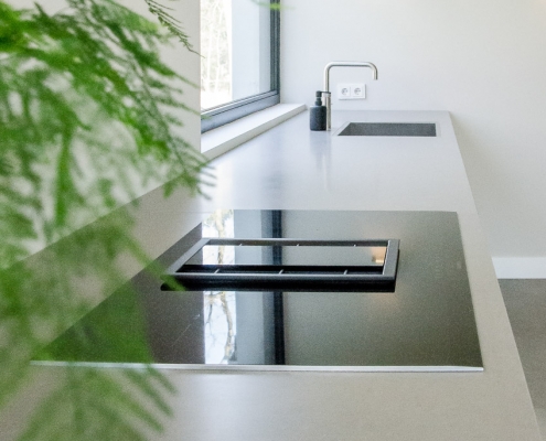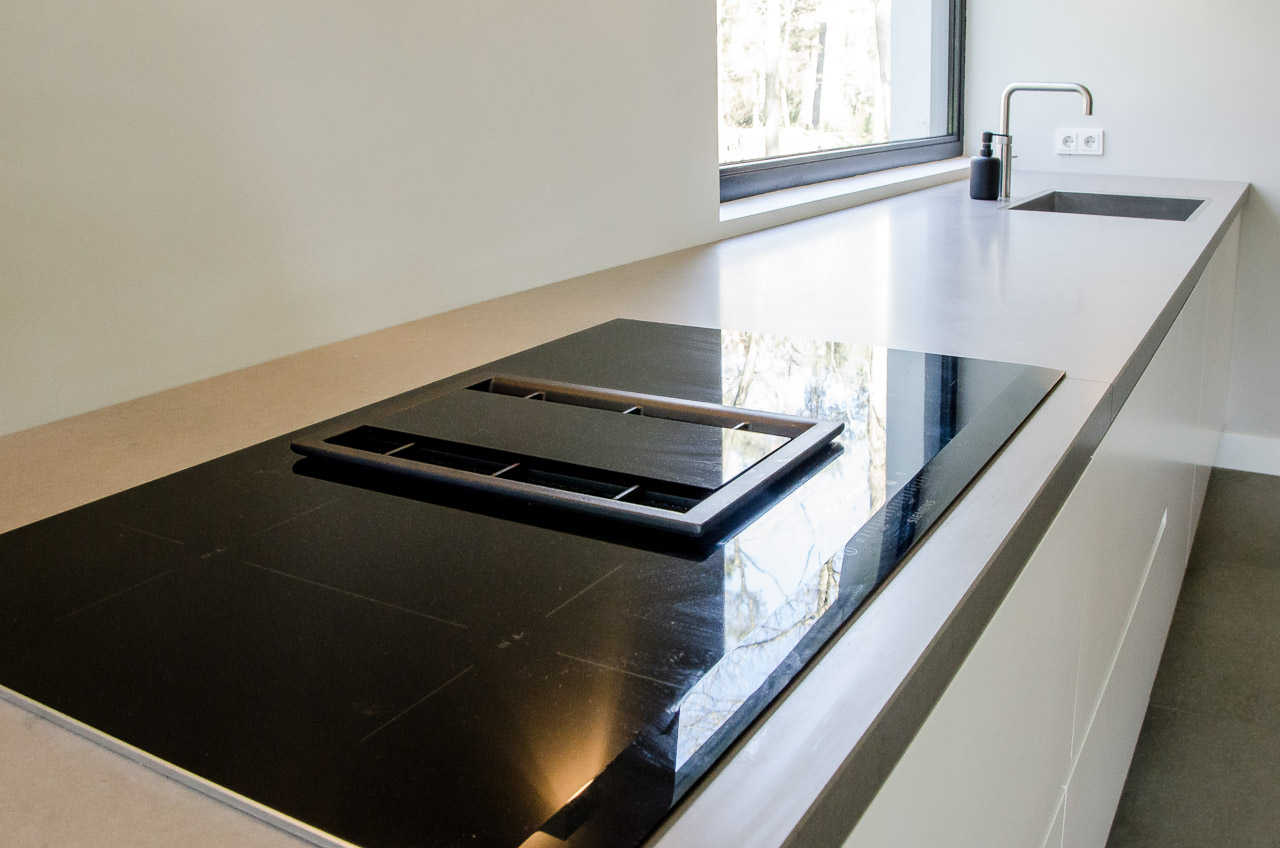 Deze op maat gemaakte keuken met een werkblad van composiet heeft een vlakinbouw spoelbak. De keuken heeft een inductiekookplaat met geïntegreerde afzuiging. Ideaal, zo heb je geen lelijke afzuigkap meer in het zicht!
