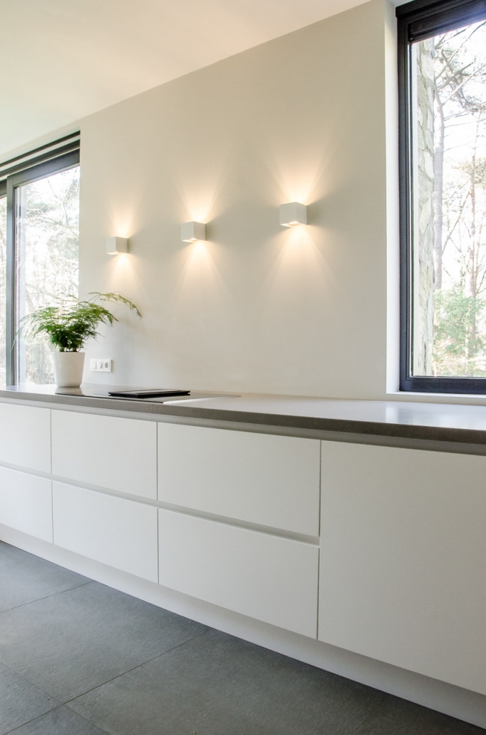 De lage keuken kasten zijn greeploos en de hoge kastenwand heeft RVS grepen.